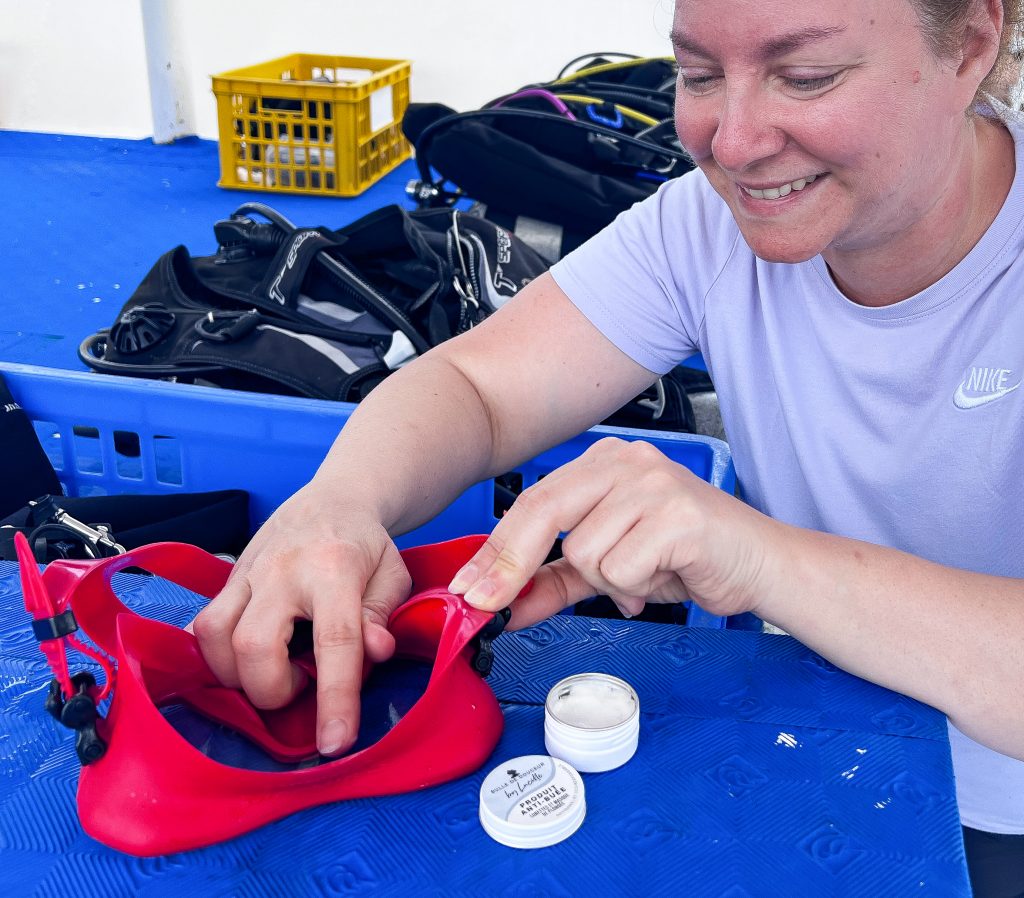 Lucille, créatrice de produits cosmétiques bio nous a proposé de tester son produit anti-buée. Nous avons profité d’un séjour avec 15 plongeurs pour le leur faire essayer. Ce produit pour lunettes et masque de plongée se présente sous la forme d’une pâte épaisse réalisée avec des ingrédients naturels et présenté dans une boîte métallique. Avant la plongée, il suffit d’humidifier son doigt, de le frotter sur la pâte et d’étaler une très fine couche sur la vitre à l’intérieur du masque. Puis il faut rincer le masque. Nos testeurs l’on tous trouvé bien plus efficace que d’autres produits et ils ont aussi apprécié son côté écolo.