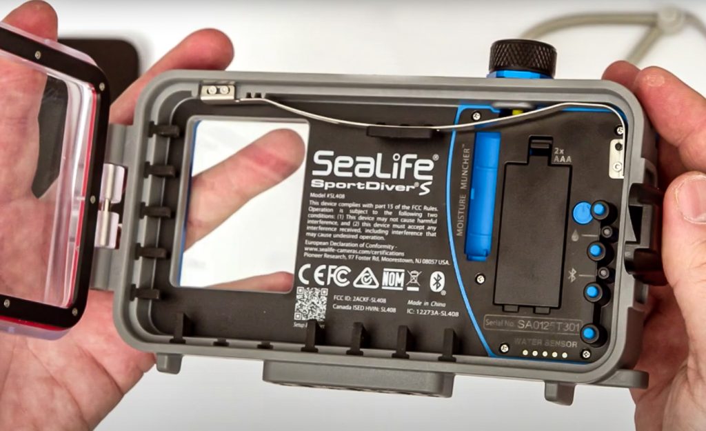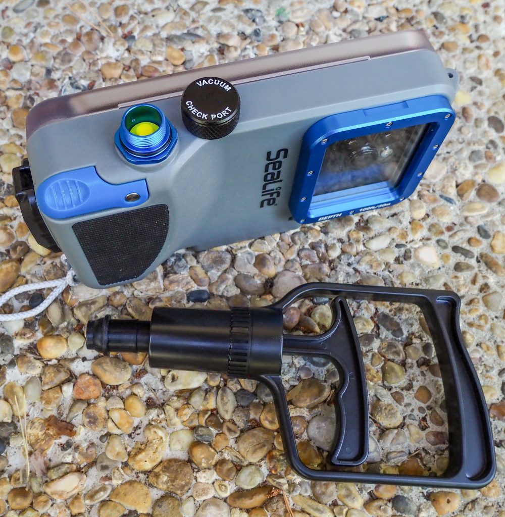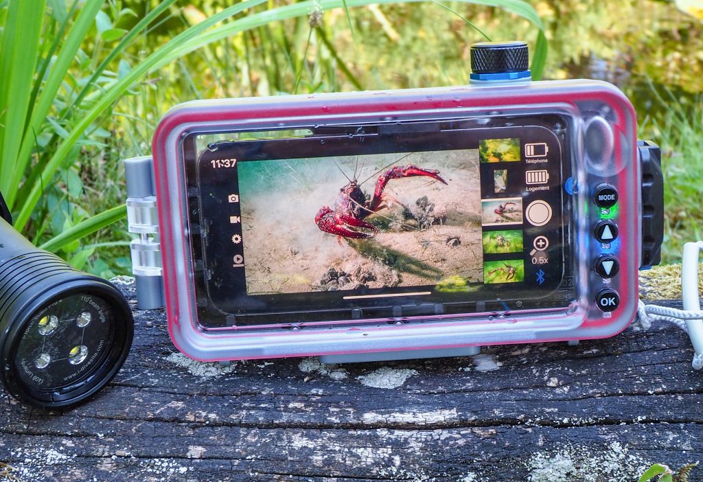 Le caisson est assez compact et léger. Il mesure 21 cm de long, 12,5 cm de haut, 5,5 cm de large et pèse (sans téléphone) 673 g. Il est fabriqué en polycarbonate avec quelques pièces en aluminium et un hublot en verre optique. Il est étanche jusqu’à 30 mètres (nous vous le confirmons). Il possède un mécanisme sécurisé de fermeture de sa porte. Sous le caisson on trouve 3 pas de vis Kodak pour le fixer sur une platine. Sur la droite, 4 boutons sont placés à l’arrière du caisson. Ils permettent d’accéder, via le dispositif Bluetooth interne au caisson (alimenté par les batteries), aux fonctions de prise de vue d’une application gratuite à télécharger sur le téléphone. Le déclencheur est quant à lui positionné sur le devant du caisson, en haut à droite. Ainsi les commandes sont accessibles facilement avec le pouce et l’index de la main droite. L’installation du téléphone dans le caisson est simple et rapide. Une fois en place, il est parfaitement maintenu par une languette flexible et les petites plaquettes en caoutchouc. Avant de fermer la porte du caisson il faut ouvrir l’application sur le téléphone pour que le dispositif Bluetooth se connecte automatiquement. Quand la porte est verrouillée l’application demande d’effectuer une procédure de vérification d’étanchéité en utilisant la pompe à vide en la plaçant dans le vacuum situé sur le dessus du caisson. En fin de contrôle l’application valide (ou non) l’autorisation de mise à l’eau. Cette procédure est rassurante et enlève la crainte de noyer son précieux téléphone. Lors de nos plongées avec le SportDiver S tous les membres de notre petite équipe ont pu l’essayer et ils ont été conquis par sa facilité de prise en main, sa qualité de fabrication et sa simplicité d’accès aux réglages de prise de vue via l’application Sealife. Il nous a permis de réaliser de sympathiques images de nos rencontres subaquatiques. C’est un bon produit à un prix raisonnable.
